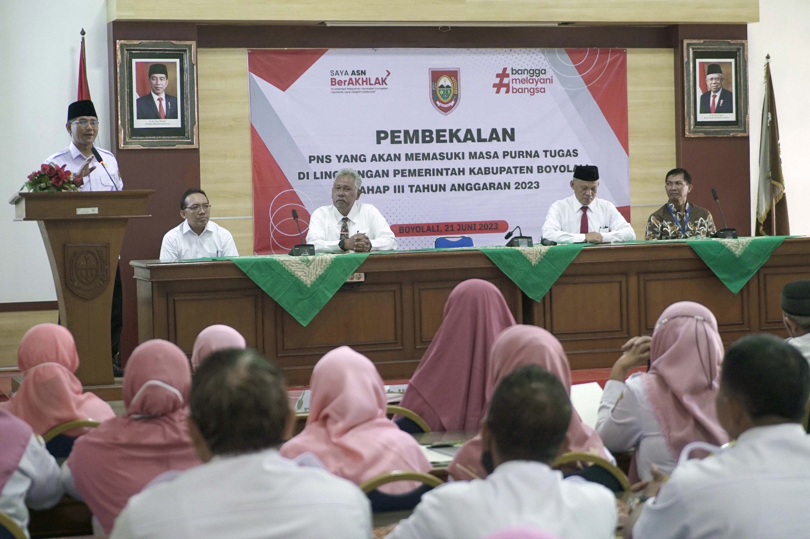 RILISJATENG.COM– Badan Kepegawaian, Pendidikan dan Pelatihan Daerah (BKP2D) Kabupaten Boyolali menyelenggarakan agenda rutin yakni Pembekalan bagi Aparatur Sipil Negara (ASN) yang akan memasuki purna tugas pada bulan Juli dan Agustus tahun 2023 ini. Kegiatan yang dihadiri langsung oleh Bupati Boyolali M. Said Hidayat tersebut dilaksanakan di Aula kantor BKP2D Kabupaten Boyolali pada Rabu (21/6/2023).