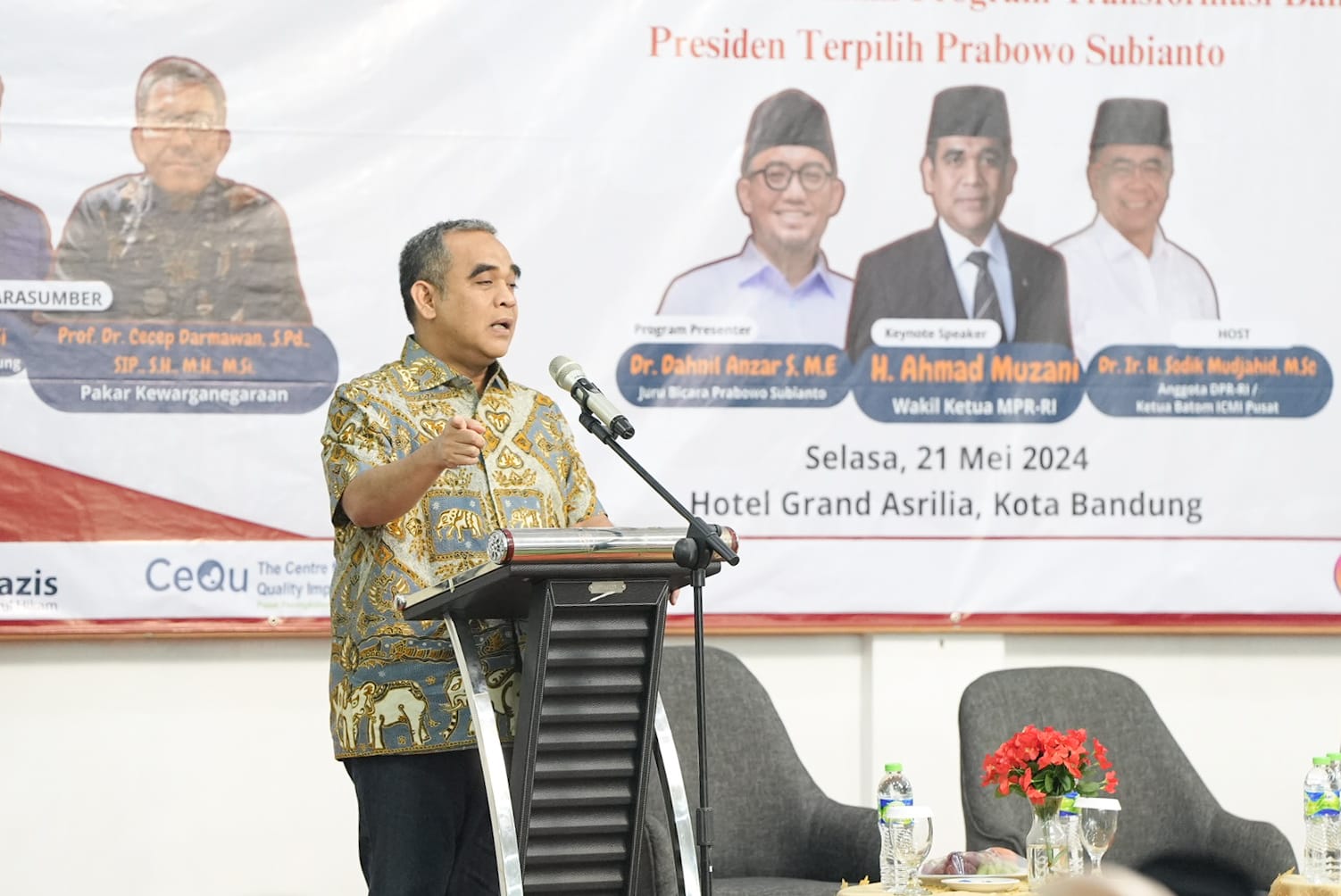 Wakil Ketua MPR Ahmad Muzani menjadi key note speaker dalam seminar kebangkitan nasional bertema, Peran dan Kontribusi Umat Islam dalam Program Transformasi Bangsa Indonesia Presiden Terpilih Prabowo Subianto di Bandung, Selasa (21/5).